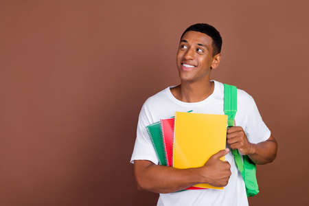 Photo of good millennial brunet guy look empty space hold copybook wear white t-shirt isolated on brown color background