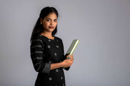 Portrait of an Asian girl wearing a pink shirt. reading a book nice back background gray studio