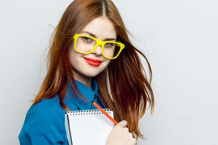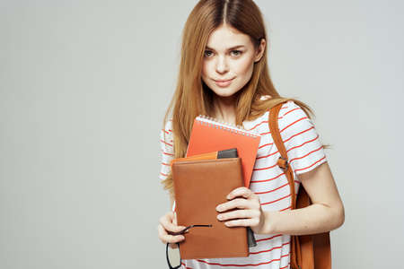 Female student with notepad and glasses on a light background cropped view of a striped T-shirt
