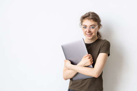 Online training, a young woman uses a laptop. A student with a laptop in her hands, a young brunette in a yellow hoodie on a blue background