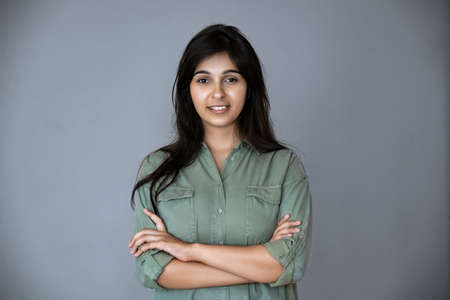 Beautiful happy dark skinned african american ethnicity woman in yellow tshirt while looking in camera with pleasant smile, posing against gray green studio wall background