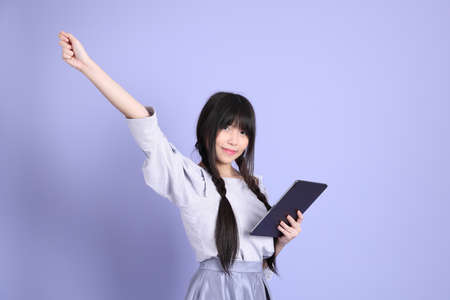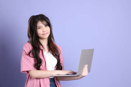The young Asian girl in purple preppy dressed standing on the purple background.