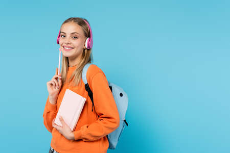 Cheerful student in headphones holding notebook and pen isolated on blue