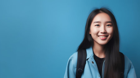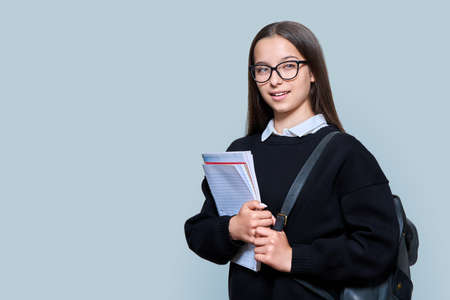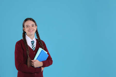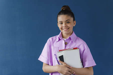 Smiling teenage girl posing with workbooks on blue background. Beautiful schoolgirl