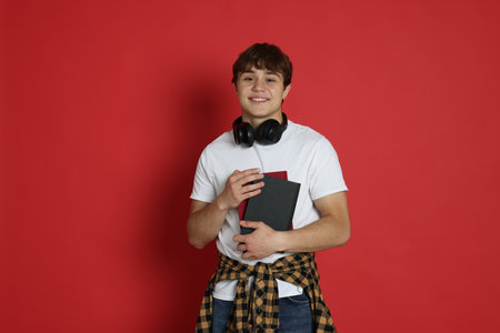 Smiling boy with curly hair holding notebooks against bright blue background, embodying trendy and cheerful school lifestyle