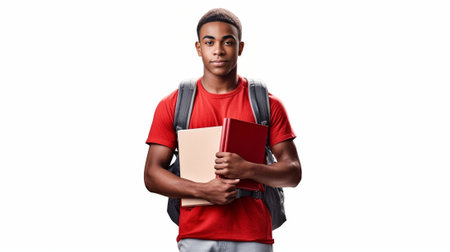Puzzled black ethnic schoolboy purses lips with bewilderment carries papers and textbooks closely wears red clothes isolated over white background People education and kn : Generative AI