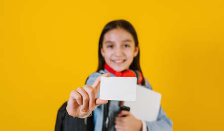 Young latin teen child girl student holding a blank empty card isolated on yellow background in Latin America