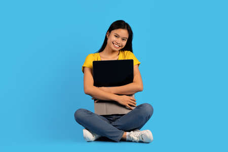 Cheerful millennial asian female in yellow t-shirt sitting on floor, hugging laptop, isolated on blue background