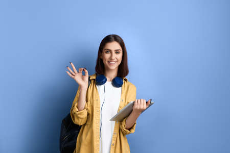 Happy smiling student girl is showing okay gesture with one hand and holding tablet with the other one, recommends application, wearing yellow shirt, white t-shirt, black bag and headphones over neck