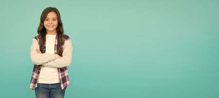 Studio shot of glad child. childhood happiness. Pleasant emotions. stylish teen girl turquoise background. pretty teen girl with long hair. kid fashion advertising. Back to school. copy space