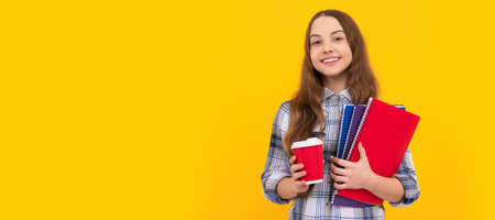 cheerful teen girl in checkered shirt holding coffee cup and notebook. Banner of schoolgirl student. School child pupil portrait with copy space.