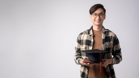 Asian young male student wearing bag and carrying books smiling and happy expression with isolated white background