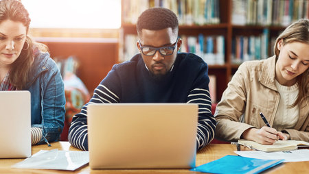 Group of students engaging in studying at library table with bookshelves in background focusing on academic work and using technology creating concentrated atmosphere