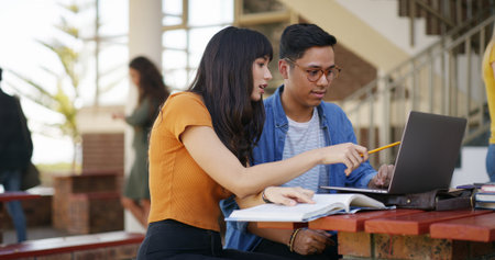 Portrait of young Asian woman explaining study tests to friend while sitting at desk in college classroom surrounded by books on table
