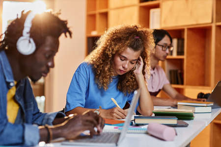 Diverse group of students in row studying in college library, focus on young woman writing in notebook