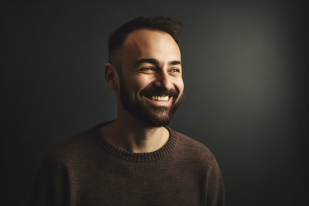 Portrait of a smiling bearded man on a dark background. Copyspace.