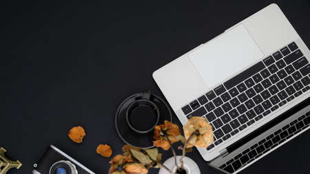 Top view of dark modern workspace with copy space, laptop, coffee cup, camera and vase on black table background