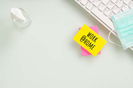 Work at home for quarantine times in Coronavirus Covid-19 pandemic outbreak background concept. Mockup sticky note on home office desk table during virus pandemic. Online Working.