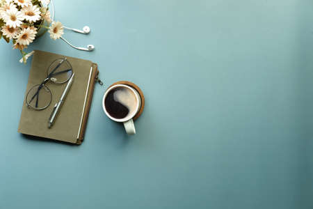 Top view notebook, pen, earphones and coffee cup on table.