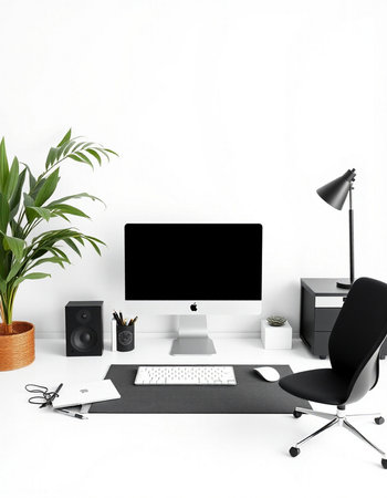 A sleek and modern workspace featuring a large desk with a computer monitor, stylish chair, and minimal decor, fostering an atmosphere of creativity and productivity.