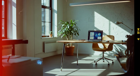 A bright, modern office with large windows, a laptop on a desk, and industrial-style architecture.
