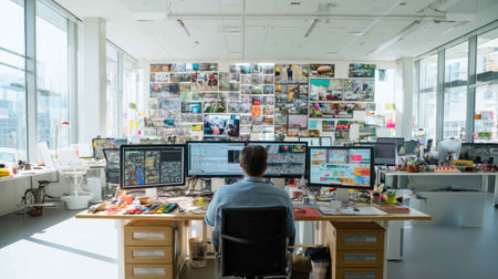 A person sits at a desk in a bright office, engaged with multiple computer monitors and surrounded by inspiring images, showcasing a dynamic creative workspace.
