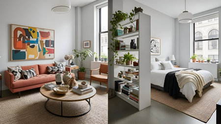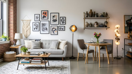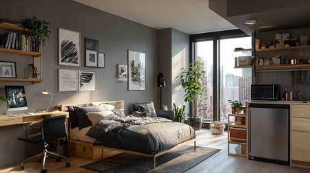 A cozy modern studio apartment featuring stylish decor, natural light, and a comfortable layout. Ideal for urban living and relaxation with contemporary furnishings.