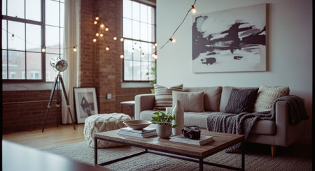 Modern living space with large windows and stylish furniture in a cozy urban loft setting