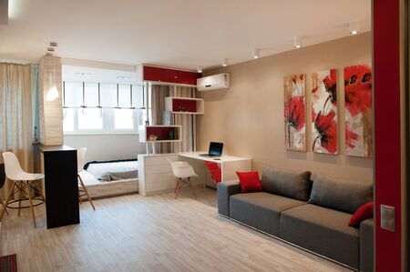 Interior of stylish and sunny studio apartment with bedroom and kitchen