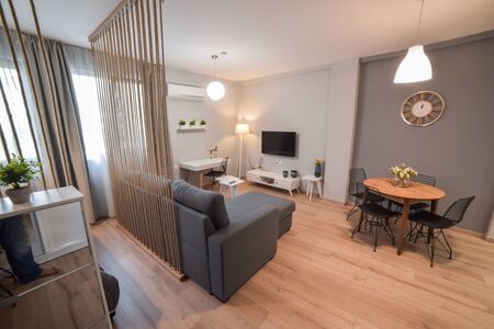 New scandinavian design after renovation. White and wooden furniture, empty space