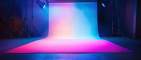 A vibrant photography studio featuring a colorful backdrop and professional lighting equipment, creating a dynamic environment perfect for artistic photo shoots.