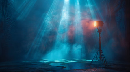 Studio spotlight shining brightly against a deep blue backdrop, creating a dramatic and cinematic atmosphere