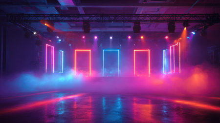 Colorful neon lights shine brightly in a contemporary space creating a lively atmosphere for a dance party. Vapor fills the air enhancing the energetic vibe of the event.