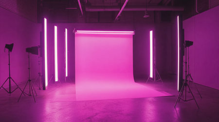 Vibrant photo studio with bright pink lights and professional equipment. Suitable for photography, media production, and artistic themes.