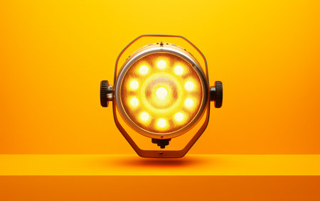 A close-up of a professional photography spotlight emitting warm light against a dark backdrop, ideal for creative projects and artistic photography.