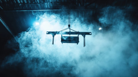 Captivating scene featuring suspended equipment surrounded by swirling smoke and dramatic lighting, creating an intense and atmospheric visual experience.