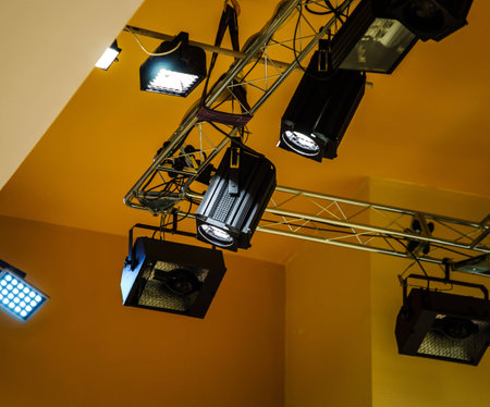 Lighting kit in concert hall. Spots over the scene.