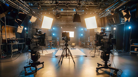 Wide shot of an empty TV set pre-production with lighting and cameras.