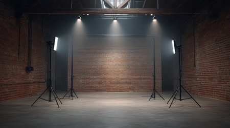 A versatile studio space featuring warm soft lighting and a rustic brick wall, ideal for photography and creative projects. Perfect for artistic expressions.