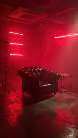 Interior of a dark room with red lighting and a leather armchair
