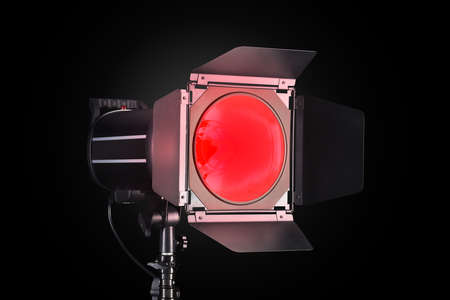 Studio light equipments for photo or film movie video. Light set for professional shooting studio background. LED Flood light and Spot light for video production studio. Setup include Barn door softbox.