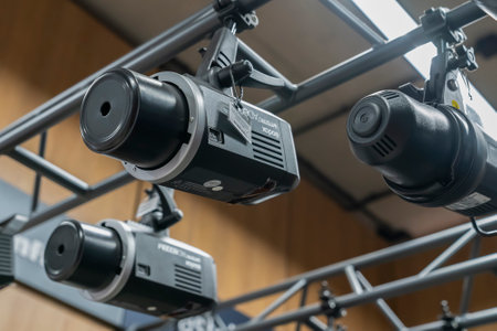 Lighting equipment hanging from ceiling in television studio