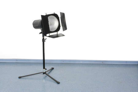 photo Studio interior, white cyclorama, colored backgrounds, lighting device on a tripod