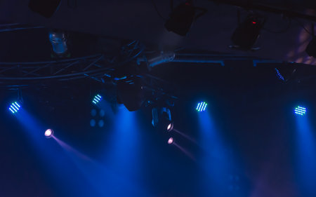 Concert spotlights.Blue and white rays of powerful projectors on stage