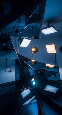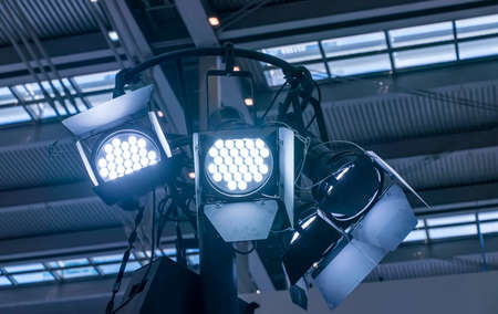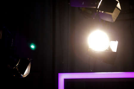 Professional lighting equipment in the studio of a news broadcaster during a live transmission.