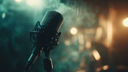 Microphone in focus against a blurred backdrop of moody lights and ambient smoke, creating a dramatic and atmospheric scene. Perfect for music, performance, and audio themes