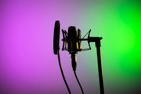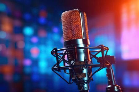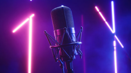 A professional microphone captures a unique moment with colorful neon lights illuminating a dark space. Perfect for music and performance themes.