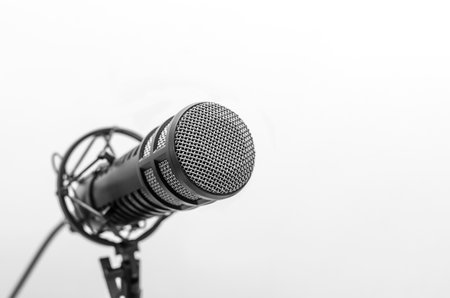 Professional condenser microphone on a microphone holder close up with copyspace. Live podcast and streaming concept at home.