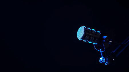 microphone for audio record or Podcast concept, single microphone on dark shadow background with copy space