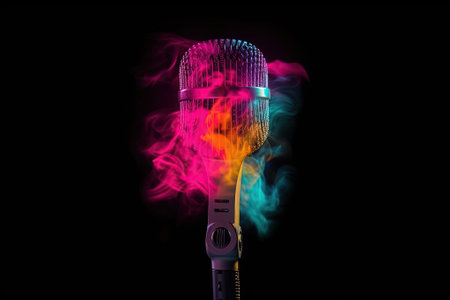 Microphone on black with color smoke fog background. Mic design for singer, entrepreneur, podcast, voice artist. Generative AI